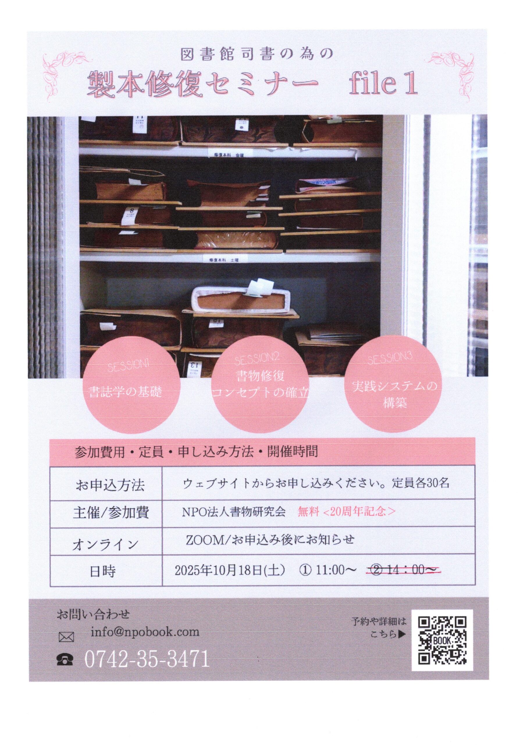 | 図書館司書の為の書物修復セミナー(無料online) 午後の部開催なし